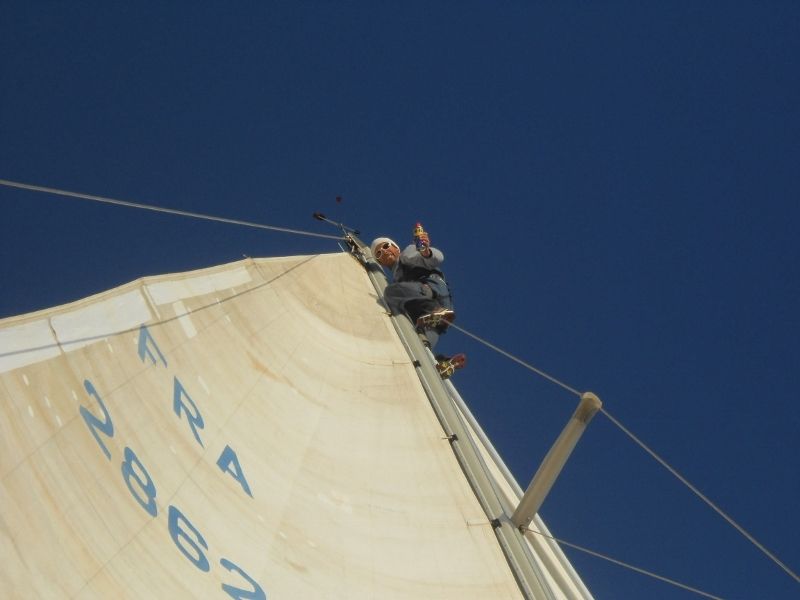 Au matin du 3 janvier 2015, nous voilà en direction du passage du Cap de la Nao. Au départ, le vent est quasi nul, Lionel en profite pour monter au mât afin d’aller donner un ptit coup de WD 40 car notre anémomètre (le petit tourniquet qui mesure la vitesse du vent) semble ne fonctionner qu’au-delà de 20 nœuds, en dessous, il indique zéro… Puis il démonte le feu avant qui ne fonctionne plus, examine le matériel et oublie de remettre le capot du feu qui reste sur le pont à l’avant du bateau… Capot qui sera emporté par les vagues dans la journée…